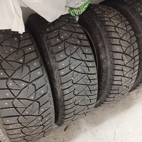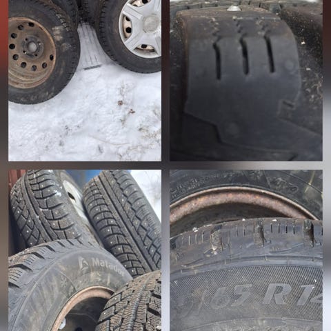 Hyväkuntoiset nastarenkaat Fordin peltivanteilla. Pintaa n. 7mm. Nastat hyväkuntoisia ja vain yksi nasta kahdesta renkaasta lähtenyt irti. Renkaat tasapainossa. Mukaan mustat pölykapselit.