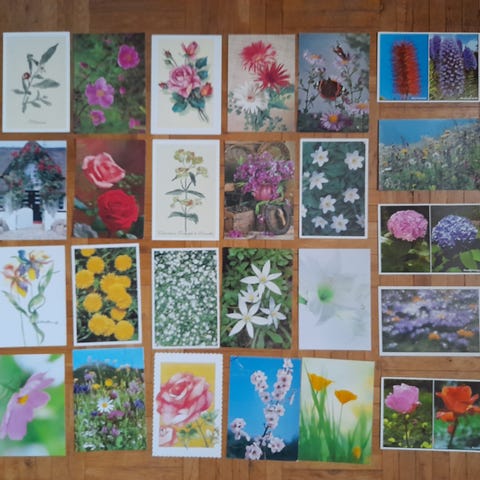 54 kpl kulkeneita postikortteja, aiheina kukkaset