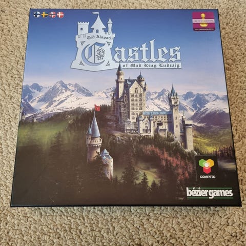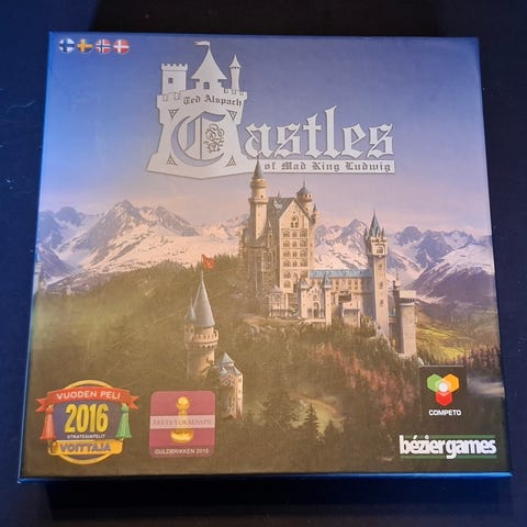 Bezier Games Castles of Mad King Ludwig lautapeli. Peli on linnanrakennusteemainen strategiapeli, jossa pelaajat rakentavat huoneista koostuvia linnoja ja keräävät pisteitä eri huonetyypeistä ja niiden sijoittelusta. Pakkaus sisältää pelilaudan, erilaisia huonelaattoja, pelimerkkejä, rahaa ja ohjekirjan. Peli on suunniteltu 1-4 pelaajalle ja sopii perhe- ja harrastepelaamiseen. Peli on kieliriippumaton komponenttien osalta, ohjeet ovat painettuina useilla kielillä laatikon sisä- tai ulkopuolella näkyvien tietojen mukaan.