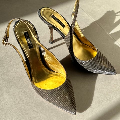 Dolce & Gabbana korkokengät, koko 40 mutta sopivat hyvin myös 38-39 jalkaan, ainakin oma jalka on sen kokoinen ja ovat itselle sopivat. Sisämitta päästä päähän n. 26cm, hopea osa ~25,5cm.