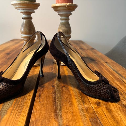 Vuoden 1998 mallistosta. Todella hyvin säilyneet. Korkolaput ovat täysin uudenveroiset. Kengät ovat aitoa nahkaa ja valmistettu italiassa. Ainoa maininta on pohjassa oleva pieni tyypillinen värin kuluma. Koron korkeus n. 11,8cm koko matkalta. Tästä hyvät laadukkaat, aidot vintage design korkokengät edullisesti, samaa mallia myyty 199-300e hintaan second handina.