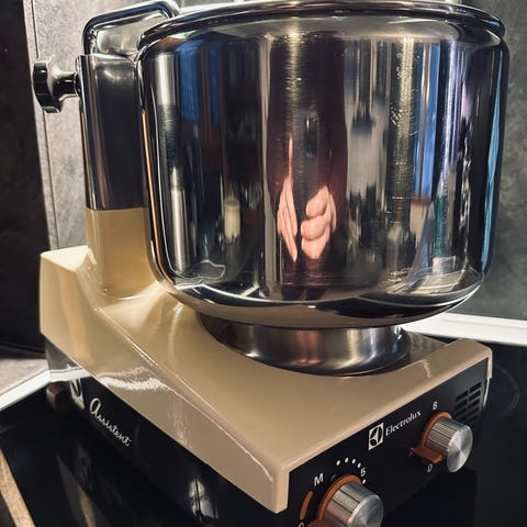Taikinakonetta on hädin tuskin käytetty, kun kulhon etiketti on yhä kiinni. Laitteessa on pieni kosmeettinen vaurio, jo laitteen saatuani kaupasta - normaali takuu on yhä voimassa. Minulla tämä ei päässyt käyttöön.