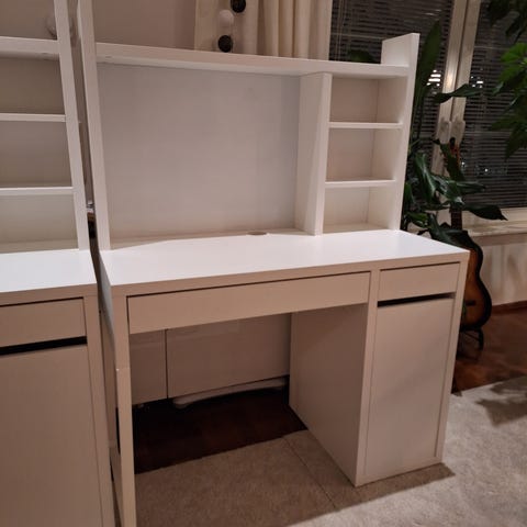Ikean Micke työpöytä. Hyvässä kunnossa muuten paitsi leveässä ylälaatikossa käytönjälkiä (viimeinen kuva). Ollut säilytyksessä lämmitetyssä varastossa.