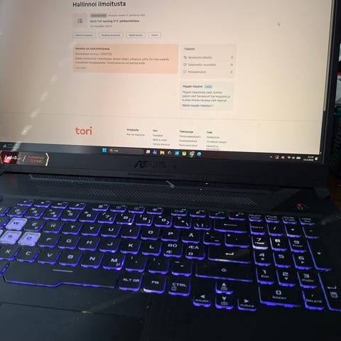 kannettava tietokone musta. Näppäimistössä on taustavalaistus. Mukana virtalähde ja virtajohto.