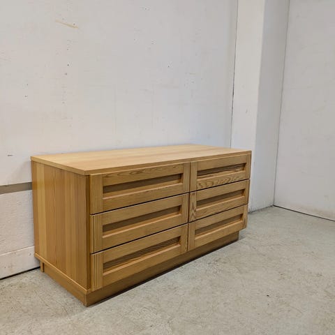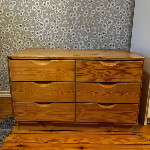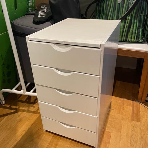 Laatikosto on maalattu valkoiseksi. Maali on kulunut nurkista. Kaikki laatikot ehjiä ja liukuvat hyvin.