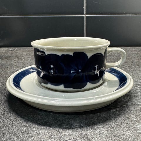 Arabian valmistama Anemone-sarjan käsinmaalattu teekuppi ja aluslautanen. Keramiikkaa, jossa tummansininen kuviointi kupissa ja tummansininen raita aluslautasessa.