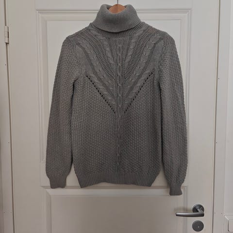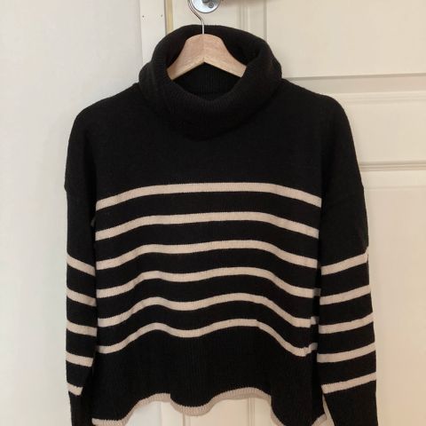 Siisti käytetty vilan musta-beige poolokauluksellinen neule pusero kokoa M. Yläosa sileää neulosta ja alaosa ribattua neulosta. Pienet halkiot sivuissa. Pesuhaitua/nyppyä pinnassa.