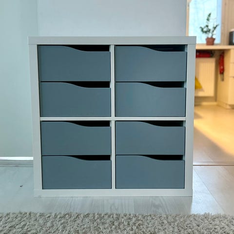 Ikean Kallax 8 lokerikon hyllykkö, 4 koria ja 4 kaappia