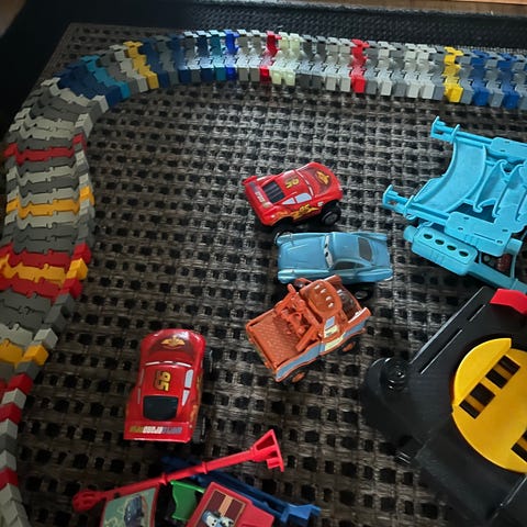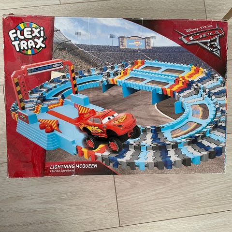 Kuvassa näkyvä Flexi trax Disney Cars -autorata + Salama McQueen -auto. Lisäksi kuvassa näkyvät radan lisäpalat. Muutoin siisti ja hyväkuntoinen, mutta pahvinen katsomo-koriste on vähän kärsinyt ja katsomosta puuttuu yksi pahvinen tuki.