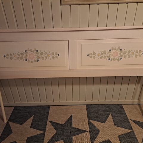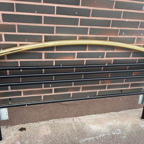 Beige kangaspäällysteinen sängynpääty 160 cm leveälle parisängylle. Kiinnitys neljällä n. 9 cm pitkällä ruuvilla.