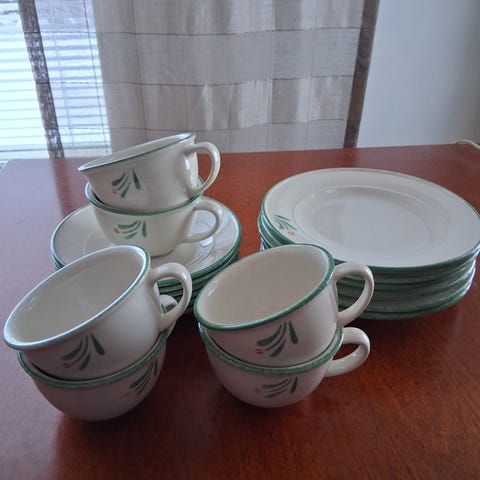 Pentikin kahvikuppeja,lautasia,kermakko ja sokerikko. Koko setti kerralla. Ehjiä ja siistejä.