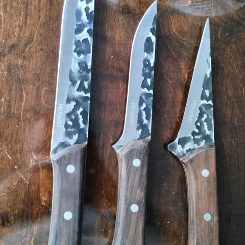 Käyttämätön veitsisarja, jossa viisi veistä ja teline. Terä metallia.