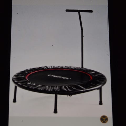 Gymstick trampoliini käsituella. Pyöreä sisäkäyttöön soveltuva trampoliini, jossa musta hyppymatto ja punainen reunus. Varustettu säädettävällä käsituella tasapainon tukemiseen. Soveltuu esimerkiksi kotijumppaan ja kevyisiin hyppy- ja tasapainoharjoituksiin.