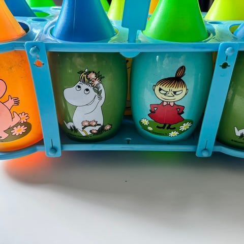 Myydään renkaanheittopeli Muumi-teemalla. Pelissä kuusi hahmoa ja neljä rengasta.