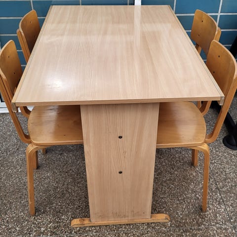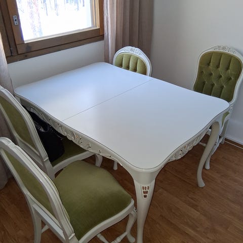 Myydän kuvanmukainen ruokapöytä ja kuusi tuolia.