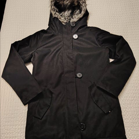 Makian harmaa parkatakki talveen. Tiivistä ja tuulta hyvin pitävää laadukasta villasekoitekangasta, joka ei nuppaannu. Vuorikangas ja vanuvuori. Suuri huppu ja pystykaulus. Metallinen vetoketju, kaksi vetoketjullista sivutaskua ja povitasku. Takana kiristysmahdollisuus vyötäröllä. Suora malli, muistuttaa Story-mallin takkia, mutta eri materiaali. Koko S, mutta oversize (ollut M-kokoisella). Hartiasauma-hartiasauma-mitta 41 cm, olkasauma-helma 92cm.