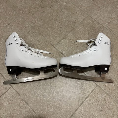 Naisten taitoluistimet, koko 38. Pohjallisen pituus noin 23 cm. Luistimet ovat nahkaa, rakenteeltaan perinteiset ja tukevat. Käytetty, mutta siistit ikään nähden, normaaleja käytön jälkiä näkyy pinnassa. Terät Olympic, Sheffield steel (Canada), vielä käyttökelpoiset. Terien kärjissä on pientä kromin kulumaa, näkyy kuvissa, ei estä luistelua. Kaikki näkyvä kunto on esitetty kuvissa, kuvat ovat osa kuvausta.