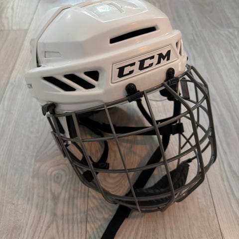 CCM FL45 jääkiekkokypärä ristikolla. Kypärä on valkoinen ja siinä on metallinen kasvosuoja, joka suojaa kasvoja jääkiekkopelissä ja -harjoituksissa. Mallissa on ilmanvaihtoaukot sekä säädettävät kiinnityshihnat ja soljet. Kypärän kokoa voi säätää. Siisti.