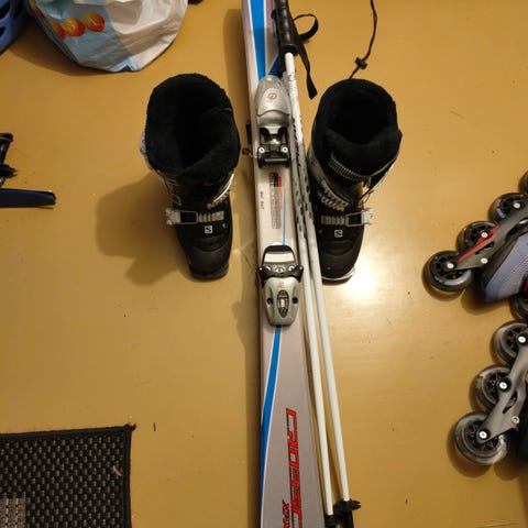 Laskettelusetti, johon kuuluu sukset siteillä, laskettelumonot, sauvat, kypärä ja laskettelulasit. Sukset ovat carving-tyyppiset ja niissä on säädettävät siteet, pituus 152cm. Monot ovat nelisolkiset ja sopivat alppihiihtoon, käytetty koossa 40/41. Sauvat ovat perinteiset sauvat, 105cm. Kypärässä on säädettävä hihna ja laskettelulasit sopivat käytettäväksi kypärän kanssa.