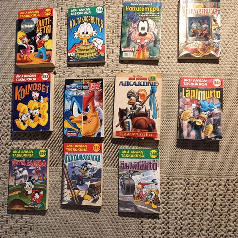 Aku Ankka taskukirja sarjakuvalehdet 5 kappaleen erä. Näkyvissä nimikkeet muun muassa Reissumies, Taskarin tähtihetket: Pörssihai, Aku Ankan taskukirja 333 Kolmoset sekä Tulon temppeli. Taskukirjat ovat suomenkielisiä sarjakuvakirjoja, joissa on useita Disney-tarinoita Aku Ankasta ja muista ankka-hahmoista. Sopivat luettavaksi lapsille ja aikuisille, jotka pitävät Disney-sarjakuvista ja Aku Ankka -tarinoista.