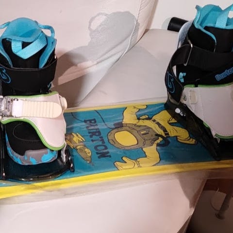 Kuvissa näkyy lisäksi lasten lumilauta ja siteet, joissa keltaiset ja siniset osat sekä punainen lauta. Merkkejä ja kokoja laudasta ja siteistä ei ole näkyvissä kuvissa.