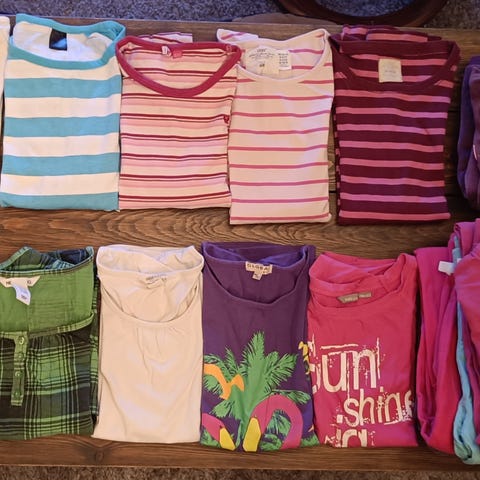 Pääasiassa 150 cm vaatetta. Kaikissa ei kokomerkintöjä, mutta kuitenkin n.150 cm kokoa lähellä. Tarkemmat tiedot näkyy vaatekohtaisesti, kun klikkaat kuvaa. Monessa paidassa mukavaa elastisuutta.