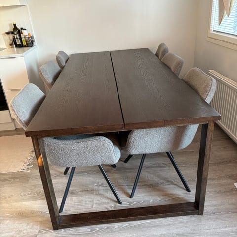 Myydään muuton vuoksi kahdeksan hengen ruokailuryhmä. Pöydän pinnan olen pitänyt kunnossa vahalla. Pöytä 230*100.