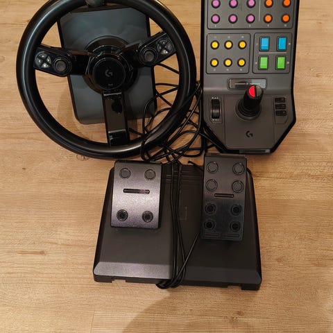 Hyvä kuntoinen Logitech G Saitek Farming ratti, polkimet ja ohjauspaneeli (PC ja PS4). Alkuperäinen laatikko mukana. Jarrupoljin ei toimi (johdossa ilmeisesti häiriö), mutta ohjauspaneelista voi jarruttaa eli ei vaikuta itse pelaamiseen. Tämä on huomioitu hinnassa.