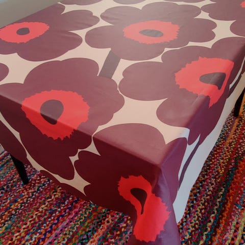 Keltainen-limen vihreä. Kooltaan 140 x 134 cm.