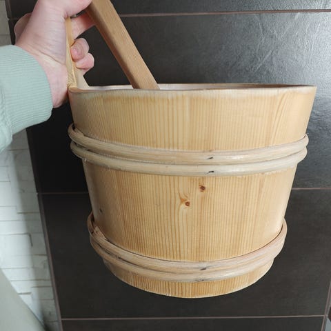 Puinen saunakiulu ja siihen kuuluva kauha. Hyvässä kunnossa.