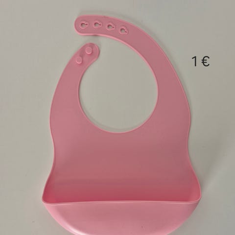 Silikoninen ruokalappu. Hiukan murtunut yhden kiinnitysreiän kohdalta, mutta ei ole vaikuttanut käyttöön.