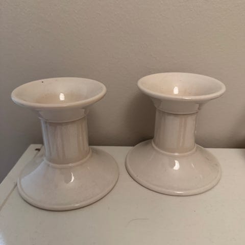 Kaksi Pentikin Vanilja-sarjan kynttilänjalkaa. Toisessa pieni musta piste, toisessa pieni sinertävä pilkku, mutta muuten kunto erinomainen, olleet käytössä vain juhlissa. Mainitsemani viat näkyy kuvissa.