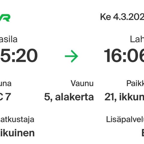 VR junalippu Pasila–Lahti 19.2.