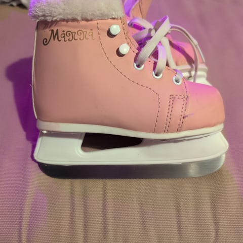 Minni lasten luistimet, koko 25. Väri pinkki, kyljissä lumihiutalekuvioita. Nauhakiinnitys. Pehmeä, tekoturkiksella vuorattu varsi tuo lisälämpöä. Soveltuvat lapsille yleiseen luisteluun.