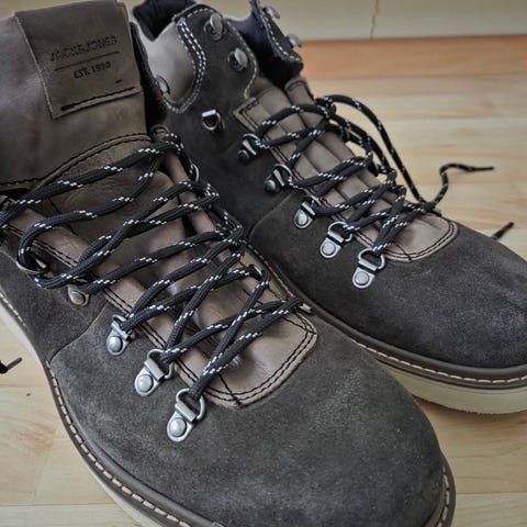 Jack & Jones talvikengät, koko 44. Varren pituus nilkkamittainen ja kaulus pehmustettu. Päällinen vaaleaa beigeä nahkaa, nauhakiinnitys metallivahvistetuilla nauhanrei’illä. Pohja karkea ja kuminen, suunniteltu tarjoamaan pitoa liukkaalla alustalla. Kengät soveltuvat talvikäyttöön ja arkiseen ulkoiluun..Lesti on kapea,joten käy myös koolle 43.