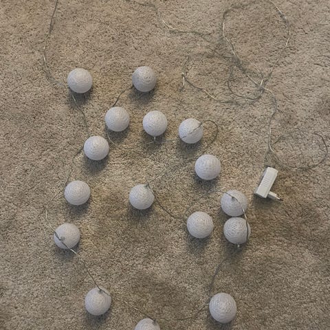 Hyvässä kunnossa oleva sininen valopalloketju. Palloja 20 kpl ja niiden välimatka toisistaan on 15cm eli pituutta valo-osuudella n. 2,85 m. Osa palloista irtoaa välillä, mutta ne on helppo laittaa paikalleen.