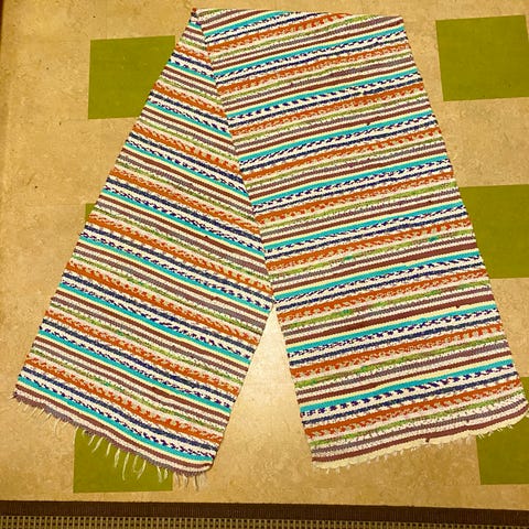Kangaspuilla kudottu Vihreä räsymatto, toimikkaalla kudottu