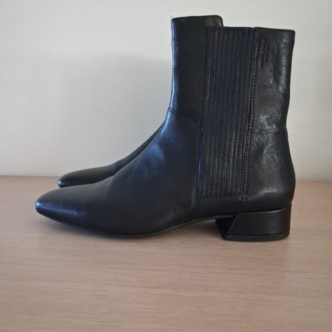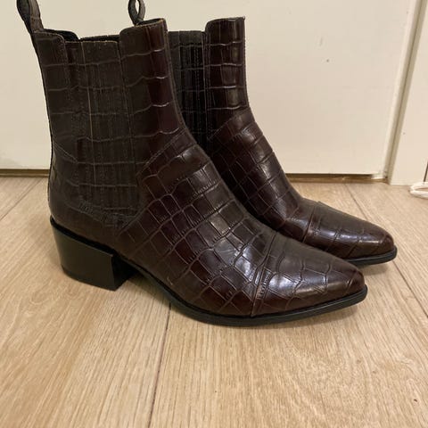Joustavalla varrella muotoiltu tyyli on valmistettu yhdistelmästä lehmännahkaa ja tekonahkaa. Saappaissa on neliskanttiset kärjet ja vetoketjukiinnitys. Levenevät tolppakorot ovat 70 mm.