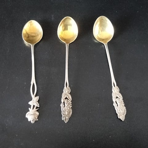 Kolme hopeista teelusikkaa, joissa 830-hopealeima. Myydään settinä, 3 kpl. Ei kaiverruksia.