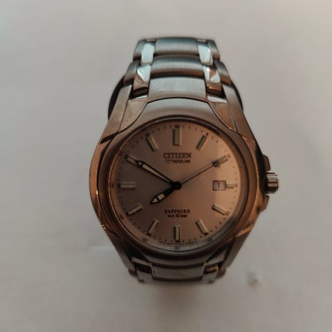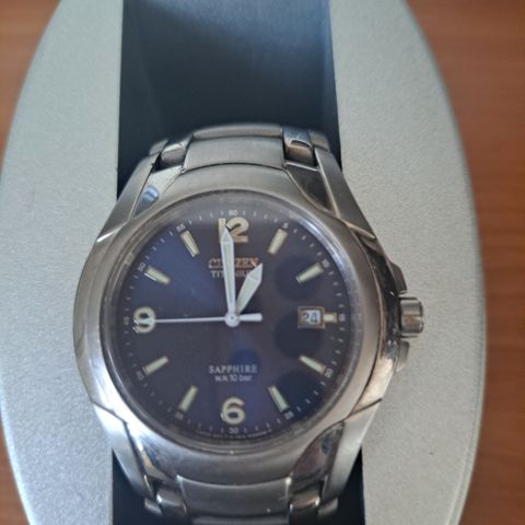 Citizen Marinaut safiirilasilla ja uudella paristolla, toimii ja päivyrin pikasiirto vaihtaa. Ei kaiverruksia, leveys ilman nuppia 39mm ä, nupin kanssa 42mm. Nouto Lohjalta tai postit ostajalle.