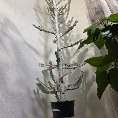 Todella helppohoitoinen mehikasvi. Toiselta nimeltä valkoinen kaktus/ white ghost. Viihtyy valoisalla paikalla, mutta ei suorassa auringossa, ainakaan totuttamatta.