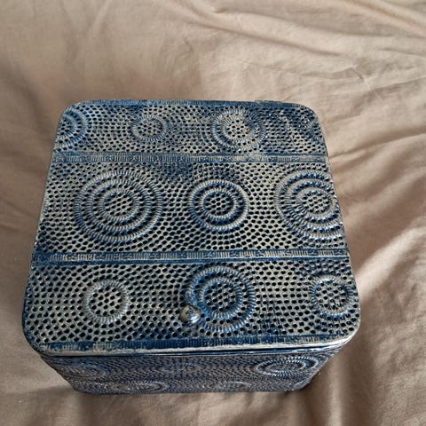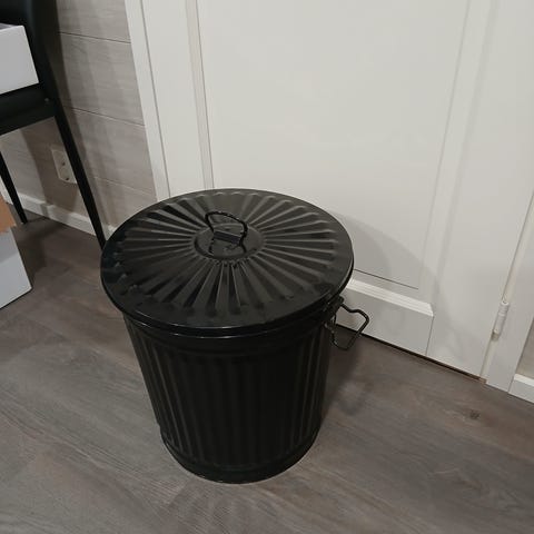 Musta, metallinen , suht kookas säilytysastia, jossa nostokahvallinen kansi.