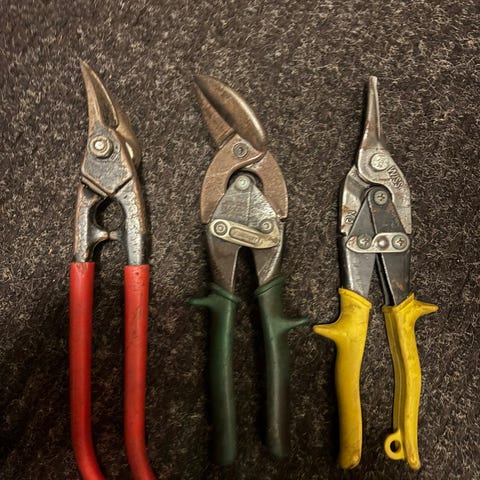 Kolmen työkalun setti, johon kuuluu kahdet peltisakset ja papukaija pihdit. Haku matinkylästä.