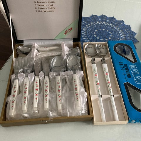 Upeat vanhat , 50-luvun alusta olevat aterimet ja juustohöylä.