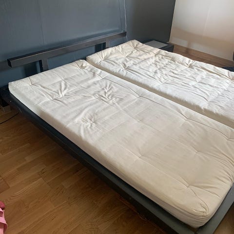 Pakettina Futon patja ja sille tarkoitettu matala runko. Patjalla ikää viitisen vuotta.
