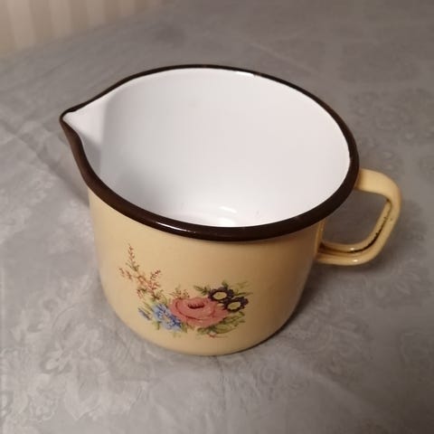 Vanha emalikulho pohjassa1 pieni reikä, pieniä emalirikkoja, kansi ehjä. Halk.21 cm kork.12 cm