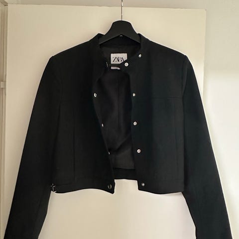 Zara naisten takki, koko M. Lyhyt malli, jossa kaulus ja edessä napitus. Väri tummansininen. Sopii käytettäväksi arkitakkina tai kevyenä päällystakkina viileämpiin päiviin.