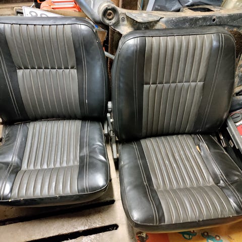 Etupenkit, erityisesti toisen niskatuki kärsinyt, muuten kohtuullisen ok 55vuotta vanhaksi. Takapenkin paremmat. Sininen kangaspenkit, kuvassa päälliset päällä.