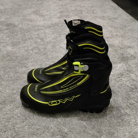 Fischer Jr Combi monot luisteluhiihtoon, koko 40. Ostettu marraskuussa 2024, joten kulumaakaan ei pahemmin ole. (Kuvan sukset on jo myyty.)