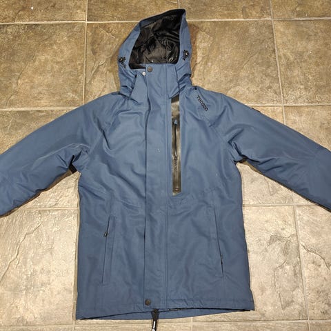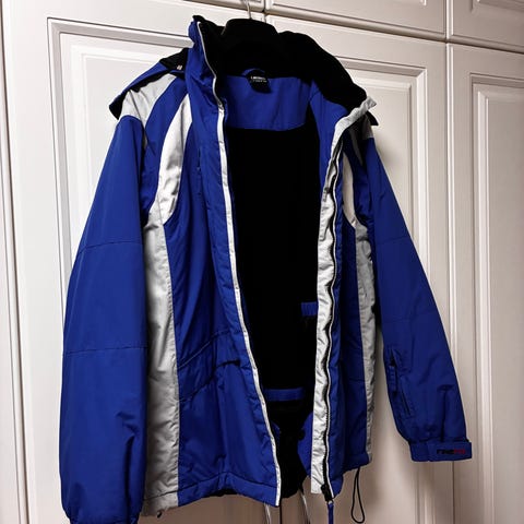 Melkein kuin uusi takki. Vähän käytetty, lähinnä mäessä. Kaikki ehjää, siistiä. Vyötärössä lumilukko. Hihassa lipputasku. 15-17 v. Kiristysnyörit hupussa ja takin helmassa.
